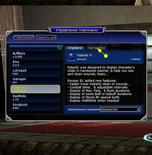 2. В левой части появившегося окна выбираем Palantir II, а в правой активируем закладку "Настройки":