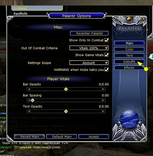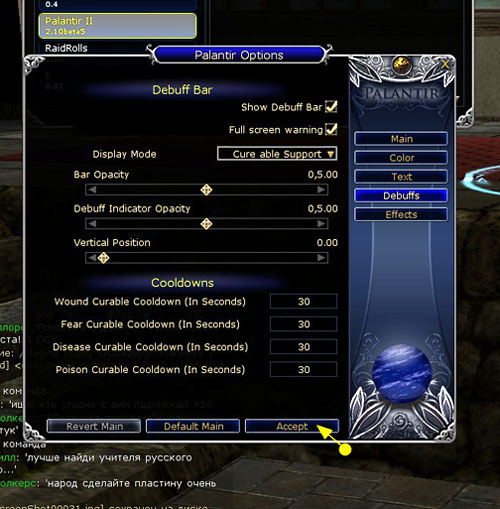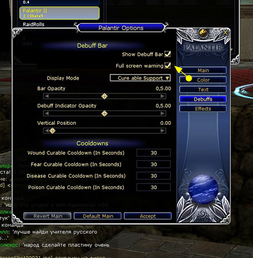 5. Ставим галочки на опциях Show Debuff Bar и Full screen warning: