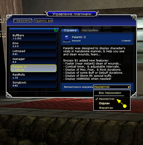 8. Вернемся в к закладке "Справка". Выбираем персонажа (персонажей), для которого установленные плагины будут при старте игры загружаться автоматически.