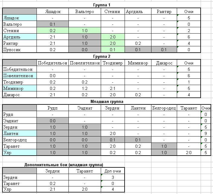 Из каждой группы выходят два персонажа, набравшие максимальное количество очков в боях в группе.